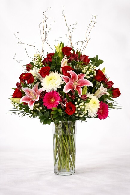 An Extra Large Arrangement of Premium Red Roses, Stargazer Lilies, Pink Gerbera Daisies, White Cremons, White Hypericum, Pink Alstromeria, Curly Willow, etc.