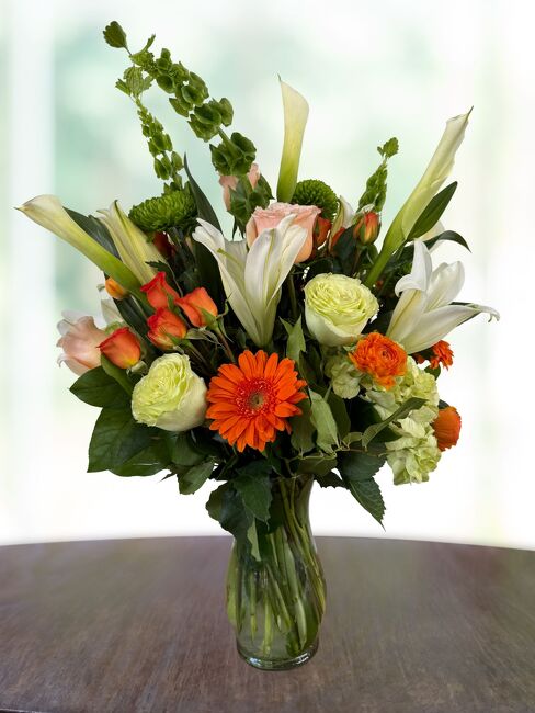 A Modern clean lux bouquet - aesthetically pleasing and comforting to any space. Filled with orange accents of Gerber Daisey's and spray roses, along side with Garden Roses, Cala lily's and Bells of Ireland.